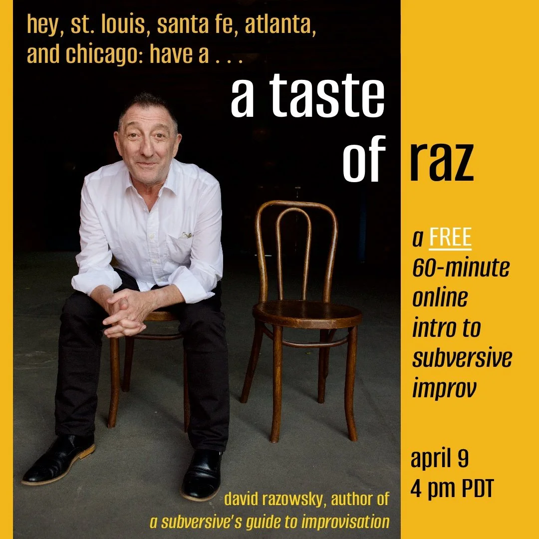 If you’ve ever wondered what all the fuss is about regarding my “subversive” improv method, the Taste of Raz is for you. (I’m looking at you, St. Louis, Atlanta, Santa Fe, and Chicago!)