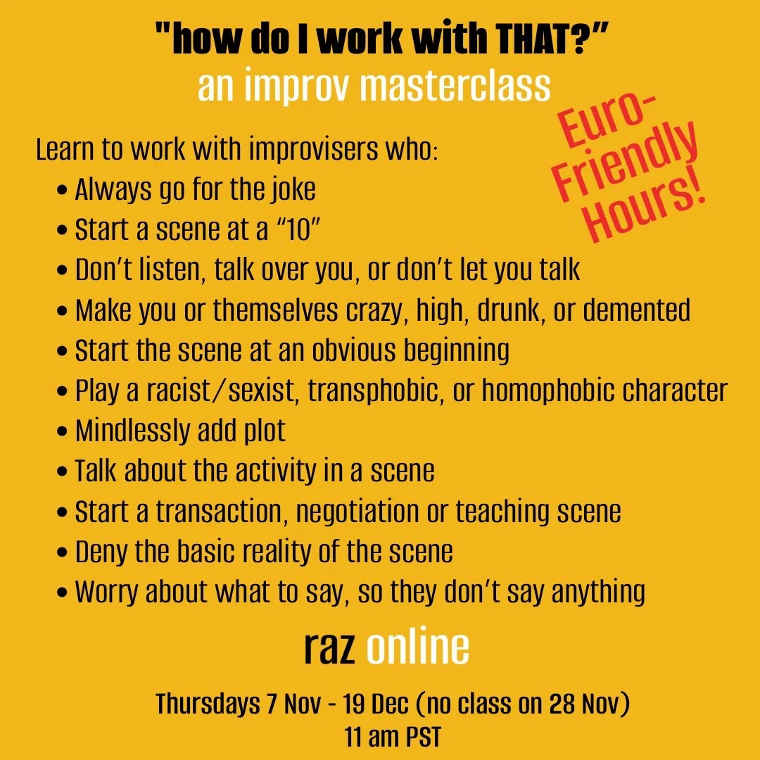 There are more improv jams than ever, which means more opportunities to perform, sometimes with great players, sometimes with challenging ones. The four-week online masterclass will help you create exciting scenes no matter what anyone tosses at you. This workshop is from my groundbreaking book, A Subversive’s Guide to Improvisation.