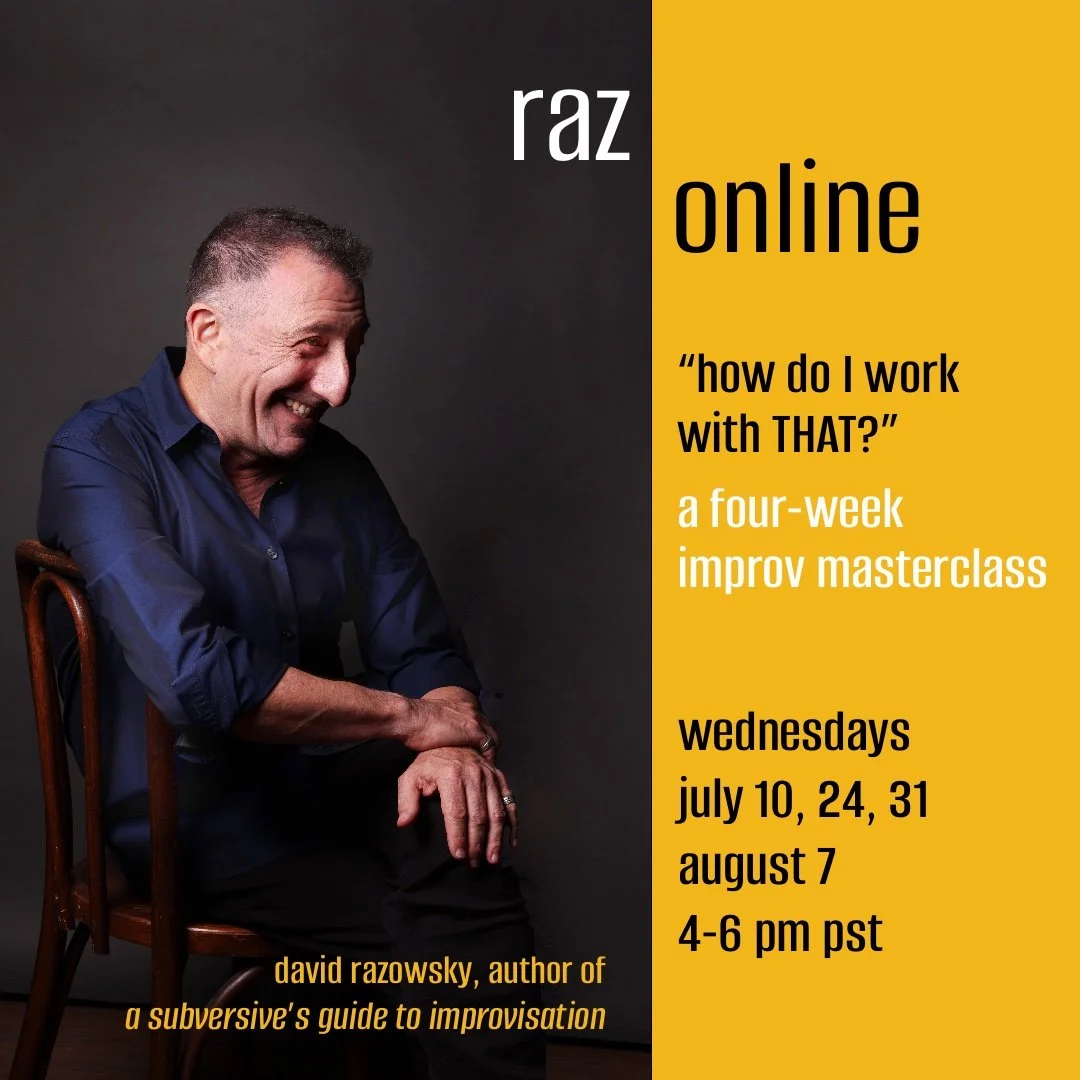 There are more improv jams than ever, which means more opportunities to perform, sometimes with great players, sometimes with challenging ones. The four-week online masterclass will help you create exciting scenes no matter what anyone tosses at you. This workshop is from my groundbreaking book, A Subversive’s Guide to Improvisation.